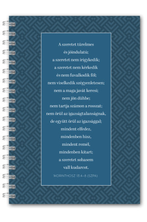 Igényes megjelenésű ikerspirálos, csíkos jegyzetfüzet, fényes elő- és hátlappal, bibliai idézettel.