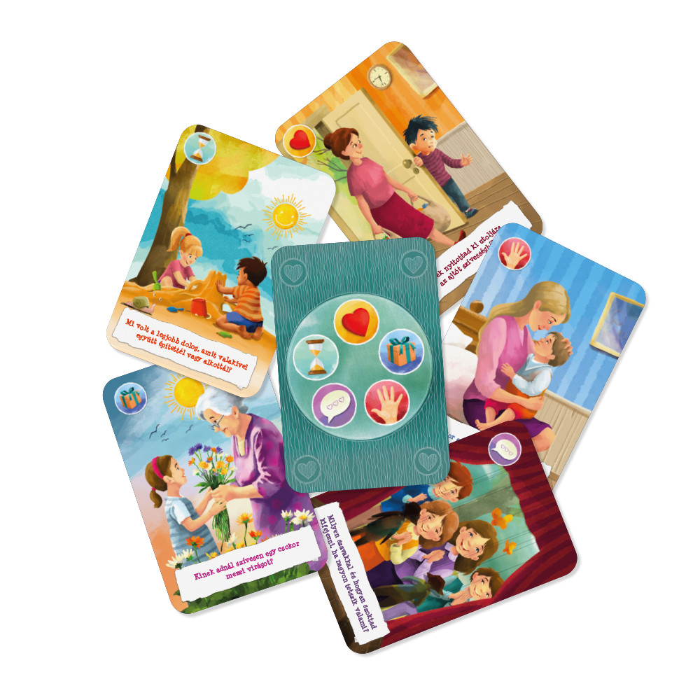A szeretetnyelvek segítenek abban, hogy ne csak adjunk szeretetet, hanem valóban el is juttassuk azt a gyermek szívéhez. A Szívmanó és a szeretetnyelvek kártyajáték célja, hogy a gyermekek és nevelőik érzelmi kommunikációjának fejlődését játékosan támogassa. A Szívmanó és a szeretetnyelvek kártyajáték célja, hogy segítsen játékos formában, mesés illusztrációkkal bevezetni a gyerekeket az öt szeretetnyelv világába, miközben az érzelmi kommunikációjuk is fejlődik.